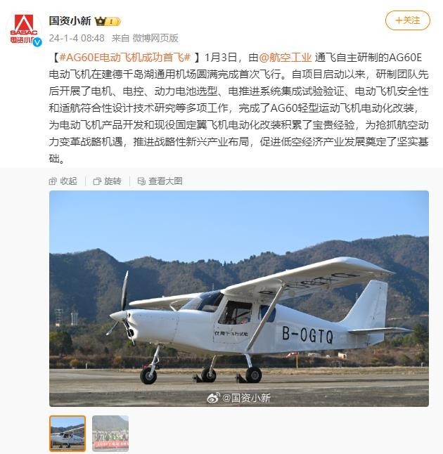 央視網(wǎng)消息:據(jù)@國資小新 消息,1月3日,由@航空工業(yè) 通飛自主研制的AG60E電動飛機(jī)在建德千島湖通用機(jī)場圓滿完成首次飛行。自項(xiàng)目啟動以來,研制團(tuán)隊(duì)先后開展了電機(jī)、電控、動力電池選型、電推進(jìn)系統(tǒng)集成試驗(yàn)驗(yàn)證、電動飛機(jī)安全性和適航符合性設(shè)計(jì)技術(shù)研究等多項(xiàng)工作,完成了AG60輕型運(yùn)動飛機(jī)電動化改裝,為電動飛機(jī)產(chǎn)品開發(fā)和現(xiàn)役固定翼飛機(jī)電動化改裝積累了寶貴經(jīng)驗(yàn),為搶抓航空動力變革戰(zhàn)略機(jī)遇,推進(jìn)戰(zhàn)略性新興產(chǎn)業(yè)布局,促進(jìn)低空經(jīng)濟(jì)產(chǎn)業(yè)發(fā)展奠定了堅(jiān)實(shí)基礎(chǔ)。
