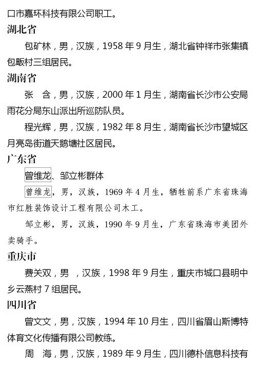 上榜勇士中有勇斗持刀犯罪嫌疑人身負重傷的張照杰、姚玉龍、王沖、王永芳;有從高橋跳水救人的周中磊、曾文文、周海;有從隨時可能爆炸的事故車輛中救出司機母子的湯益鑫;有冒著煤氣罐爆炸危險制服劫持孩子歹徒的蔡國榮;有救援被困電梯內同事而導致左小腿截肢的翟元敏;有休假期間水下連續(xù)救人的現役軍人柯東賢、吳金學、趙錦雄;更有見義勇為英勇犧牲的李偉倫、張嘉俊、張可可、李峰武、安西德、何同猛、曾維龍、胡喜明、李振華、東周才仁、賽西陳文11位同志,讓我們深懷敬仰,致崇高敬意!勇士們見義勇為事跡鼓舞人心、振奮精神、催人奮進。他們用血汗甚至生命秉承、詮釋了中華民族傳統(tǒng)美德,用奮不顧身的實際行動踐行了社會主義核心價值觀。