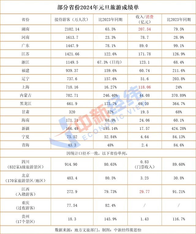 據中新經緯不完全統(tǒng)計,截至1月3日21時,全國已有20省份發(fā)布2024年元旦旅游數據。其中,湖南接待游客2102.14萬人次,暫時領跑全國;河南接待游客1613.7萬人次,位列第二;廣東接待游客1447.9萬,排名第三。此外,江蘇、浙江兩省游客接待量也超過千萬。