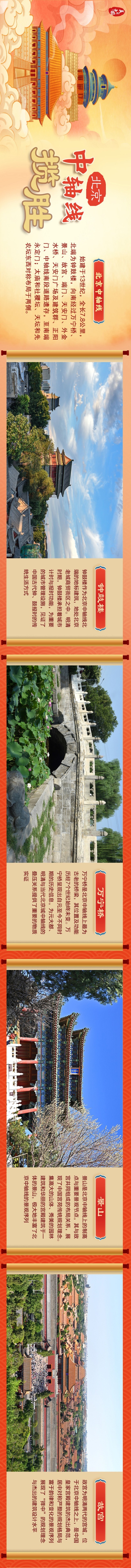 全長(zhǎng)7.8公里的北京中軸線北端為鐘鼓樓,向南經(jīng)過(guò)萬(wàn)寧橋、景山、故宮、端門、天安門、外金水橋、天安門廣場(chǎng)及建筑群、正陽(yáng)門、中軸線南段道路遺存,至南端永定門;太廟和社稷壇、天壇和先農(nóng)壇東西對(duì)稱布局于兩側(cè)。