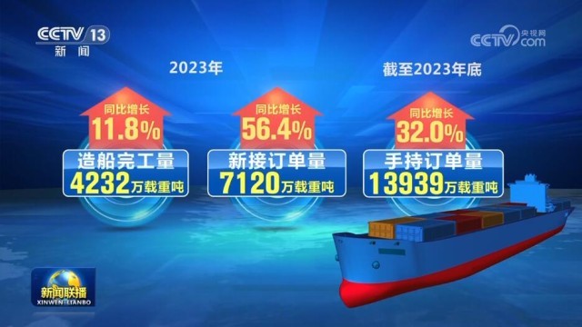 最新數(shù)據(jù)顯示,2023年我國(guó)造船完工量4232萬(wàn)載重噸,同比增長(zhǎng)11.8%;新承接訂單量7120萬(wàn)載重噸,同比增長(zhǎng)56.4%;截至2023年底,手持訂單量13939萬(wàn)載重噸,同比增長(zhǎng)32.0%,所有指標(biāo)第一次實(shí)現(xiàn)2位數(shù)增長(zhǎng)。