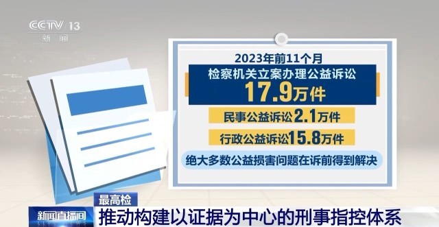 2023年前11個(gè)月,檢察機(jī)關(guān)立案辦理公益訴訟17.9萬件,其中民事公益訴訟2.1萬件、行政公益訴訟15.8萬件。絕大多數(shù)公益損害問題在訴前得到解決。