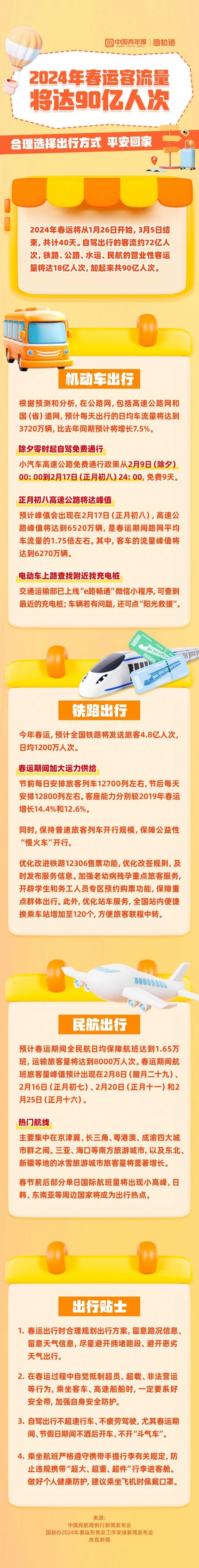 2024年春運(yùn)將從1月26日開始,全社會(huì)跨區(qū)域人員流動(dòng)量將創(chuàng)歷史新高。春運(yùn)期間:①除夕零時(shí)起自駕免費(fèi)通行;②鐵路全國站內(nèi)便捷換乘車站增加至120個(gè);③民航國內(nèi)熱門航線集中在京津冀、長三角、粵港澳、成渝四大城市群之間。你會(huì)選擇那種方式回家過年?點(diǎn)擊長圖,一起了解春運(yùn)出行保障。