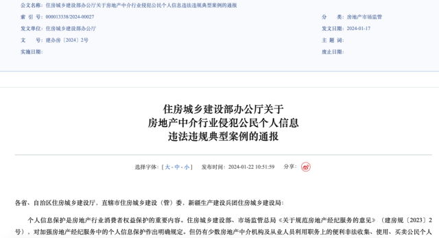 1月22日上午,住建部官網通報了5起房地產中介行業(yè)侵犯公民個人信息違法違規(guī)典型案例: