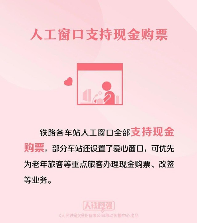 鐵路各車站人工窗口全部支持現(xiàn)金購票,部分車站還設(shè)置了愛心窗口,可優(yōu)先為老年旅客等重點(diǎn)旅客辦理現(xiàn)金購票、改簽等業(yè)務(wù)。