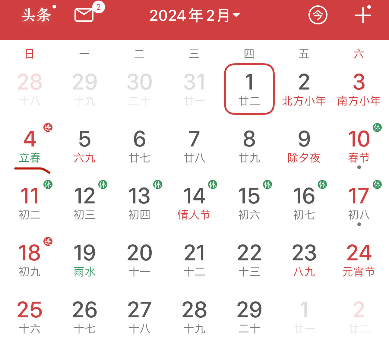 例如, 2024年的“立春日”是2月4日,即農(nóng)歷兔年的臘月二十五,而下一個“立春日”是2025年2月3日,已經(jīng)進入了農(nóng)歷蛇年的正月,所以有說法稱,2024農(nóng)歷年“無春”。