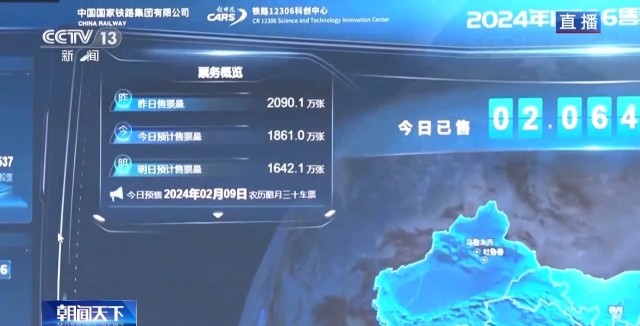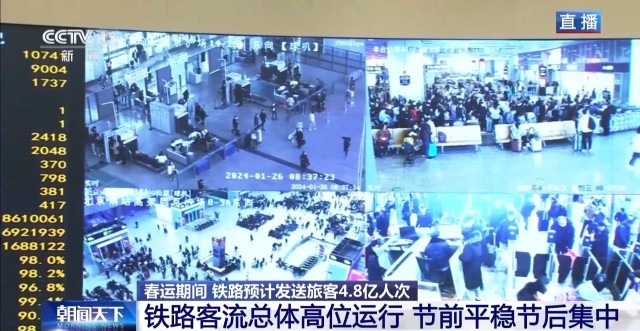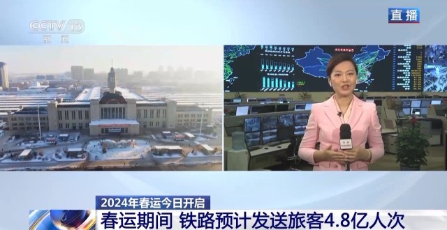 總臺(tái)央視記者 陳晰:40天春運(yùn),全國(guó)鐵路預(yù)計(jì)發(fā)送旅客4.8億人次,日均1200萬(wàn)人次。今天是春運(yùn)首日,全國(guó)鐵路預(yù)計(jì)發(fā)送旅客1060萬(wàn)人次。2024年春運(yùn)的火車票預(yù)售已經(jīng)從1月12日開始發(fā)售,從目前的售票情況來(lái)看,旅客出行需求旺盛。