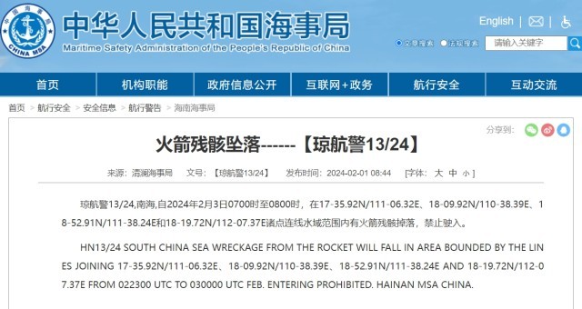 央視網(wǎng)消息:據(jù)中國海事局網(wǎng)站消息,清瀾海事局發(fā)布航行警告,2月3日7時(shí)至8時(shí),南海部分海域有火箭殘骸掉落,禁止駛?cè)搿?/p>