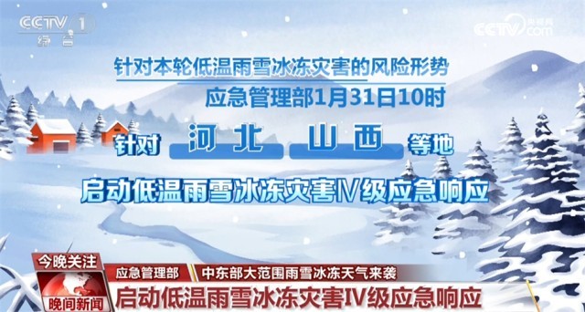 針對本輪低溫雨雪冰凍災(zāi)害的風險形勢,應(yīng)急管理部1月31日10時,針對河北、山西等地啟動低溫雨雪冰凍災(zāi)害Ⅳ級應(yīng)急響應(yīng)。同時,國家防災(zāi)減災(zāi)救災(zāi)委員會辦公室、應(yīng)急管理部等部門派出2個工作組分赴河南和湖北,協(xié)助指導(dǎo)低溫雨雪冰凍災(zāi)害防范應(yīng)對工作。中國氣象局1月31日上午啟動重大氣象災(zāi)害(雨雪冰凍)Ⅲ級應(yīng)急響應(yīng)。