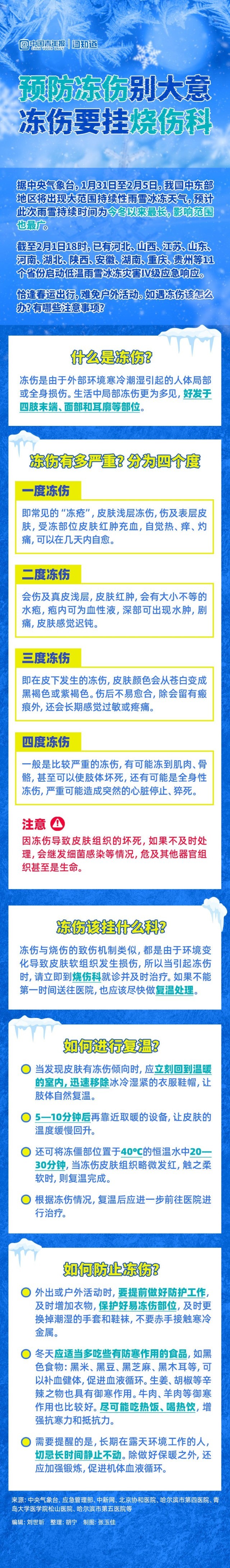 2月1日,中央氣象臺發(fā)布冰凍橙色預(yù)警。據(jù)預(yù)報,這是2009年以來冬季最強(qiáng)雨雪冰凍天氣,預(yù)計將持續(xù)6天,10省份將出現(xiàn)暴雪或大暴雪。恰逢春運出行,在旅途中也要謹(jǐn)防凍傷。如遇凍傷該怎么辦?如何緊急補(bǔ)救?想要就醫(yī)該掛什么科室?轉(zhuǎn)發(fā)收藏,祝福大家平安祥和迎春到,開心順利過大年。