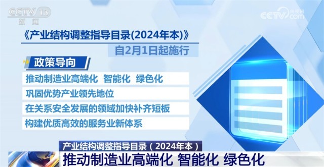 《產(chǎn)業(yè)結(jié)構(gòu)調(diào)整指導(dǎo)目錄(2024年本)》自2月1日起施行。《目錄(2024年本)》的政策導(dǎo)向是,推動(dòng)制造業(yè)高端化、智能化、綠色化,鞏固優(yōu)勢(shì)產(chǎn)業(yè)領(lǐng)先地位,在關(guān)系安全發(fā)展的領(lǐng)域加快補(bǔ)齊短板,構(gòu)建優(yōu)質(zhì)高效的服務(wù)業(yè)新體系。