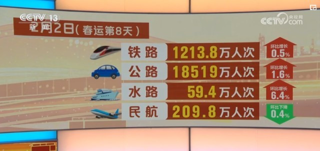 具體來看,2月2日,鐵路客運(yùn)量1213.8萬人次,環(huán)比增長0.5%;公路人員流動(dòng)量18519萬人次,環(huán)比增長1.6%;水路客運(yùn)量59.4萬人次,環(huán)比增長6.4%;民航客運(yùn)量209.8萬人次,環(huán)比下降0.4%。
