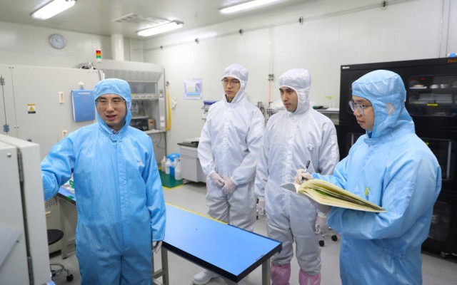 在位于沈陽(yáng)市的中國(guó)科學(xué)院金屬研究所納米碳基電子器件超凈實(shí)驗(yàn)室,孫東明(左一)與指導(dǎo)的研究生一起討論反應(yīng)離子刻蝕工藝設(shè)備的使用方法和注意事項(xiàng)(2月24日攝)。