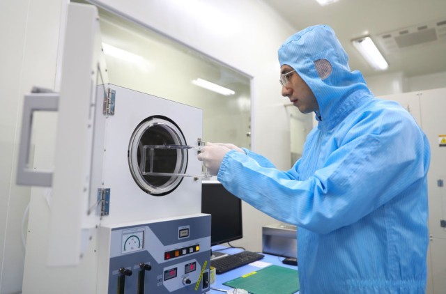在位于沈陽(yáng)市的中國(guó)科學(xué)院金屬研究所納米碳基電子器件超凈實(shí)驗(yàn)室,孫東明從前處理設(shè)備腔體中取出實(shí)驗(yàn)樣品(2月24日攝)。