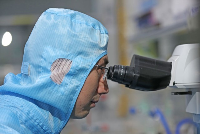 在位于沈陽(yáng)市的中國(guó)科學(xué)院金屬研究所納米碳基電子器件超凈實(shí)驗(yàn)室,孫東明在聚焦光學(xué)顯微鏡前觀測(cè)實(shí)驗(yàn)樣品的形貌(2月24日攝)。