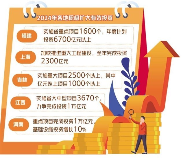 各地2024年政府工作報(bào)告中對(duì)今年如何擴(kuò)大有效投資進(jìn)行了系統(tǒng)部署,不少地方還公布了具體金額。比如,福建將謀劃實(shí)施省重點(diǎn)項(xiàng)目1600個(gè)、年度計(jì)劃投資6700億元以上;上海今年將加快推進(jìn)重大工程建設(shè),全年完成投資2300億元;吉林今年計(jì)劃實(shí)施重大項(xiàng)目2500個(gè)以上,其中億元以上項(xiàng)目1000個(gè)以上;江西今年實(shí)施省大中型項(xiàng)目3670個(gè),力爭(zhēng)完成投資1萬(wàn)億元;河南重點(diǎn)項(xiàng)目完成投資1萬(wàn)億元,基礎(chǔ)設(shè)施投資增長(zhǎng)10%;安徽開(kāi)展先進(jìn)制造業(yè)投資“領(lǐng)跑”計(jì)劃,制造業(yè)投資增長(zhǎng)10%以上。