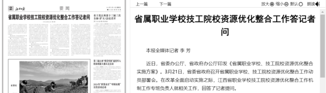 3月24日,《江西日報》發(fā)布了《省屬職業(yè)學校技工院校資源優(yōu)化整合工作答記者問》。