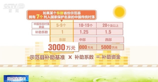 根據(jù)規(guī)定,中央財政對傳統(tǒng)村落集中連片保護利用示范縣予以定額獎補,其中東、中、西部示范縣補助基準分別為3000萬元、4000萬元、5000萬元。同時,根據(jù)示范縣擁有中國傳統(tǒng)村落數(shù)量情況賦予相應獎補系數(shù),擁有5—9個、10—19個、20個及以上中國傳統(tǒng)村落的示范縣補助系數(shù)分別為1、1.25、1.5。每個示范縣的補助資金為相應的補助基準乘以補助系數(shù)。舉個例子,如果某個東部省份示范縣擁有7個列入國家保護名錄的中國傳統(tǒng)村落,中央財政將對這個示范縣進行3000萬元獎補。