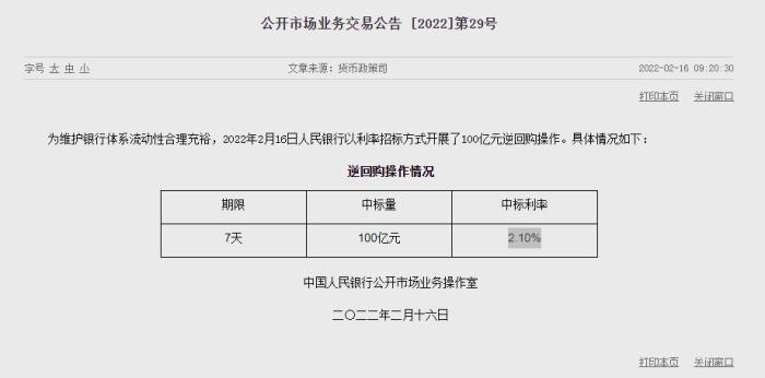 中新財經2月16日電 16日,據中國人民銀行官網消息,為維護銀行體系流動性合理充裕,2022年2月16日人民銀行以利率招標方式開展了100億元逆回購操作,中標利率2.10%。(完)