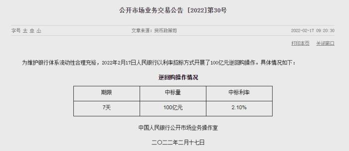 中新財經2月17日電 17日,據(jù)中國人民銀行官網(wǎng)消息,為維護銀行體系流動性合理充裕,2022年2月17日人民銀行以利率招標方式開展了100億元逆回購操作,期限為7天,中標利率為2.10%。(完)