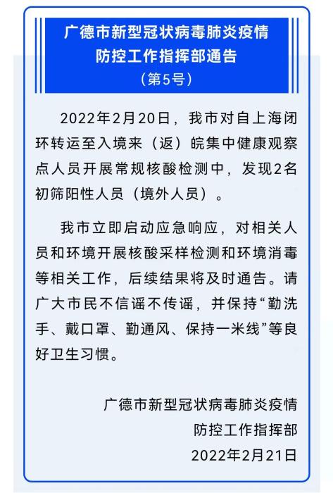 安徽廣德發(fā)現(xiàn)2名境外人員初篩陽性人員