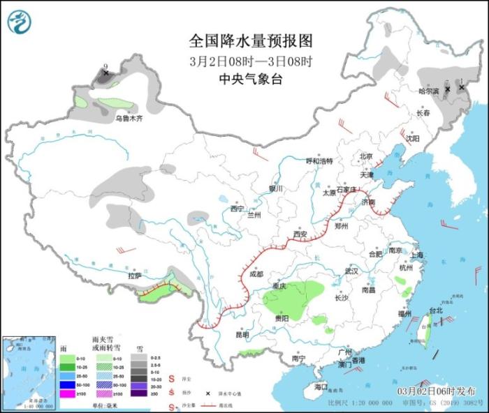 全國降水量預(yù)報圖(3月2日08時-3日08時)