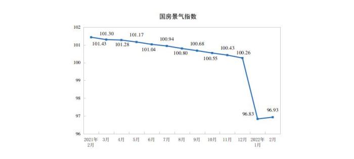 2月份,房地產(chǎn)開發(fā)景氣指數(shù)(簡稱“國房景氣指數(shù)”)為96.93。