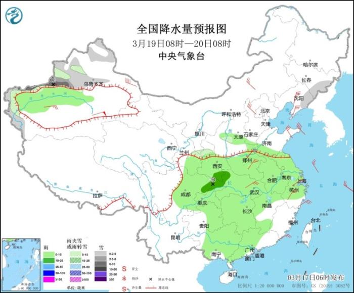 3月17日8時至18日8時,新疆北疆西部和沿天山一帶、青海北部、內(nèi)蒙古中西部、山西中北部、河北大部、北京、天津、遼寧西部等地部分地區(qū)有小到中雪或雨夾雪,其中,內(nèi)蒙古中部偏南地區(qū)、山西北部、河北西北部和北京西北部山區(qū)等地部分地區(qū)有大雪,局地暴雪(10~15毫米)。陜西中北部、河南中部、山東南部、江淮、江南大部、華南大部、西南地區(qū)東南部、臺灣島等地部分地區(qū)有小到中雨,其中,江蘇中南部、安徽東南部、上海等地部分地區(qū)有大雨,局地有暴雨(50~60毫米),上述部分地區(qū)伴有短時強(qiáng)降水(最大小時降雨量20~40毫米)。內(nèi)蒙古中西部、青海東部、黃淮、江淮、江南北部河等地部分地區(qū)有4~6級風(fēng)。渤海、黃海、東海等地部分海域有6~8級風(fēng)。