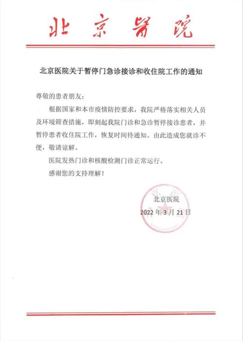中新網3月21日電 據(jù)北京醫(yī)院微信公眾號21日消息,根據(jù)國家和北京市疫情防控要求,該醫(yī)院嚴格落實相關人員及環(huán)境篩查措施,即刻起該醫(yī)院門診和急診暫停接診患者,并暫停患者收住院工作,恢復時間另行通知。發(fā)熱門診和核酸檢測門診正常運行。通知如下:
