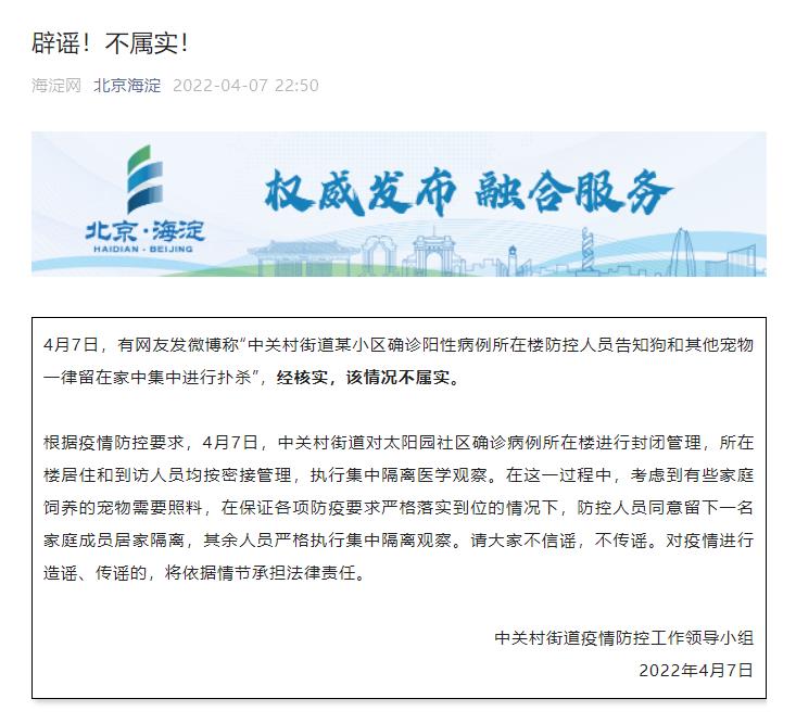 中新網(wǎng)4月8日電 據(jù)北京市海淀區(qū)融媒體中心官方微信消息,中關(guān)村街道疫情防控工作領(lǐng)導(dǎo)小組發(fā)布辟謠指出,4月7日,有網(wǎng)友發(fā)微博稱“中關(guān)村街道某小區(qū)確診陽性病例所在樓防控人員告知狗和其他寵物一律留在家中集中進(jìn)行撲殺”,經(jīng)核實,該情況不屬實。