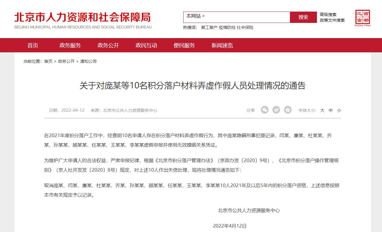 中新網4月12日電 北京市人社局網站12日發(fā)布通告指出,在2021年度積分落戶工作中,經查明10名申請人存在積分落戶材料弄虛作假行為,取消龐某等10人2021年及以后5年內的積分落戶資格。
