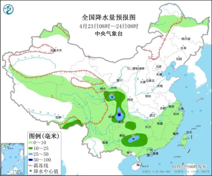 4月23日08時(shí)至24日08時(shí),新疆北疆北部、青海南部、西藏北部等地部分地區(qū)有小到中雪或雨夾雪。西藏東南部、西北地區(qū)東南部、西南地區(qū)東部、華南北部等地部分地區(qū)有中到大雨,其中,四川盆地中部等地部分地區(qū)有暴雨(50~60毫米)。內(nèi)蒙古、西藏北部等地部分地區(qū)有4~6級(jí)風(fēng)(見(jiàn)圖2)。