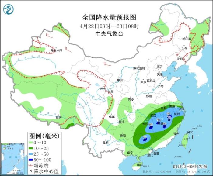 4月22日08時(shí)至23日08時(shí),新疆北疆北部、青海南部、西藏北部等地部分地區(qū)有小到中雪或雨夾雪,局地有大到暴雪。江淮南部、江漢東部、江南大部、華南北部等地部分地區(qū)有中到大雨,其中,安徽南部、湖南東部、江西中北部、浙江西部、廣西東北部等地局地有暴雨(50~70毫米)。新疆北部、內(nèi)蒙古、東北南部等地部分地區(qū)有4~6級(jí)風(fēng)(見(jiàn)圖1)。