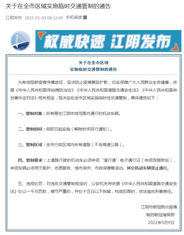 中新網5月9日電 據(jù)“江陰發(fā)布”微信公眾號消息,江蘇省江陰市新冠肺炎疫情聯(lián)防聯(lián)控指揮部9日發(fā)布關于在全市區(qū)域實施臨時交通管制的通告。通告稱,為有效阻斷疫情傳播途徑,堅決防止疫情蔓延擴散,切實保障廣大人民群眾生命健康,依據(jù)《中華人民共和國傳染病防治法》《中華人民共和國道路交通安全法》《中華人民共和國突發(fā)事件應對法》相關規(guī)定,現(xiàn)決定在全市區(qū)域實施臨時性交通管制。