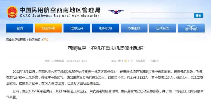中新網(wǎng)5月12日電 據(jù)民航局網(wǎng)站消息,民航局今日就西藏航空一客機在重慶機場偏出跑道發(fā)布通報。通報稱,2022年5月12日,西藏航空公司TV9833航班在執(zhí)行重慶—林芝客運任務時,在重慶機場起飛滑跑過程中偏出跑道。根據(jù)機組反映,飛機在起飛過程中出現(xiàn)異常,按程序中斷起飛,偏出跑道后發(fā)動機擦地起火,目前已撲滅。機上共計122人,其中旅客113人,機組9人,已全部安全撤離。在撤離過程中,有36人擦傷扭傷,已及時送當?shù)蒯t(yī)院檢查。