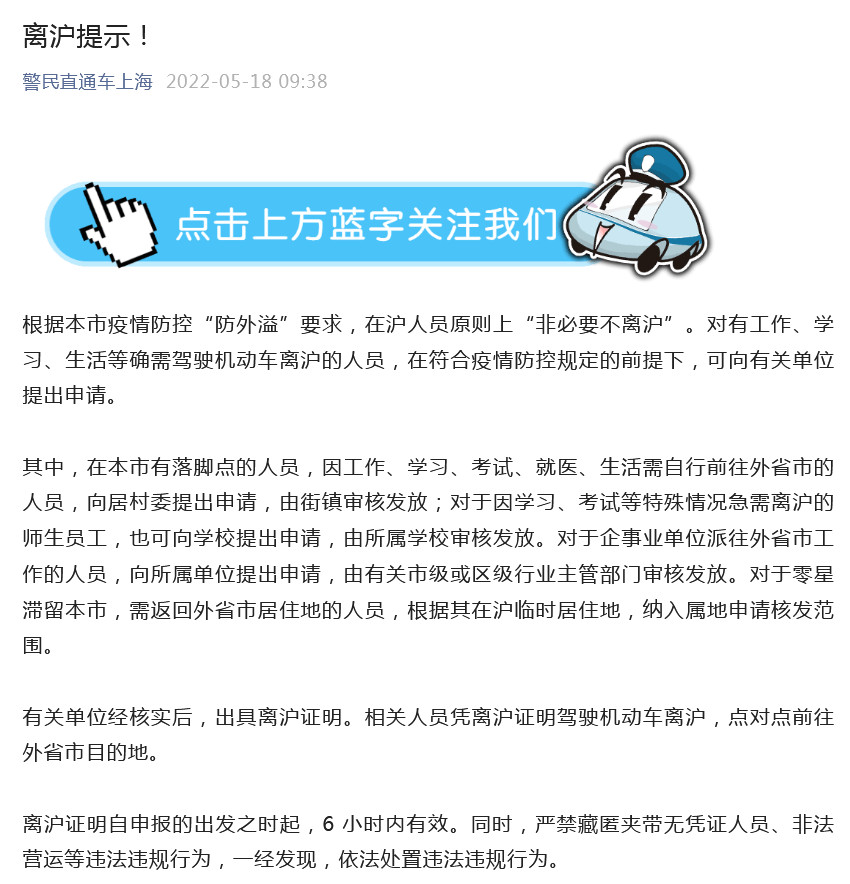 中新網(wǎng)5月18日電 據(jù)上海市公安局微信公眾號(hào)消息,根據(jù)上海市疫情防控“防外溢”要求,在滬人員原則上“非必要不離滬”。對(duì)有工作、學(xué)習(xí)、生活等確需駕駛機(jī)動(dòng)車離滬的人員,在符合疫情防控規(guī)定的前提下,可向有關(guān)單位提出申請(qǐng)。有關(guān)單位經(jīng)核實(shí)后,出具離滬證明。相關(guān)人員憑離滬證明駕駛機(jī)動(dòng)車離滬,點(diǎn)對(duì)點(diǎn)前往外省市目的地。離滬證明自申報(bào)的出發(fā)之時(shí)起,6 小時(shí)內(nèi)有效。同時(shí),嚴(yán)禁藏匿夾帶無憑證人員、非法營運(yùn)等違法違規(guī)行為,一經(jīng)發(fā)現(xiàn),依法處置違法違規(guī)行為。