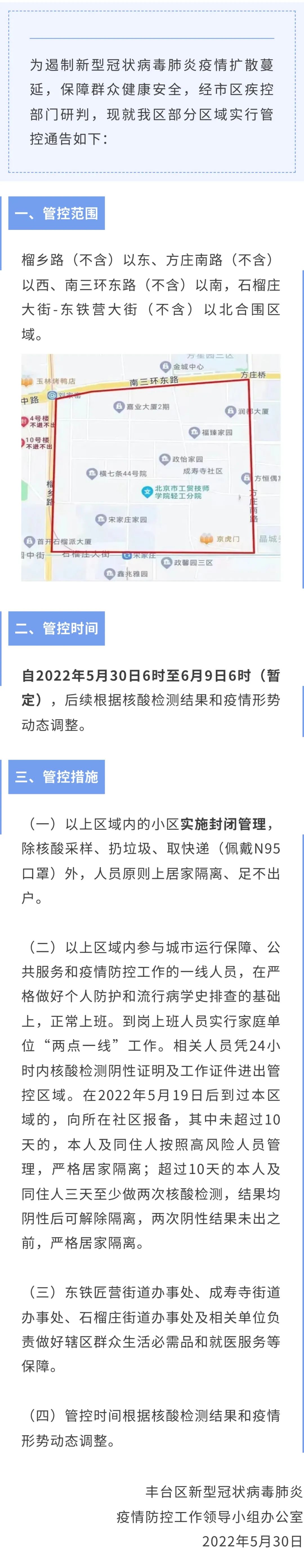 中新網(wǎng)5月30日電 據(jù)“北京豐臺”微信公眾號消息,30日,北京市豐臺區(qū)新型冠狀病毒肺炎疫情防控工作領(lǐng)導小組辦公室發(fā)布關(guān)于部分區(qū)域管控的通告。管控時間自2022年5月30日至6月9日6時,區(qū)域內(nèi)的小區(qū)實施封閉管理,人員原則上居家隔離、足不出戶。