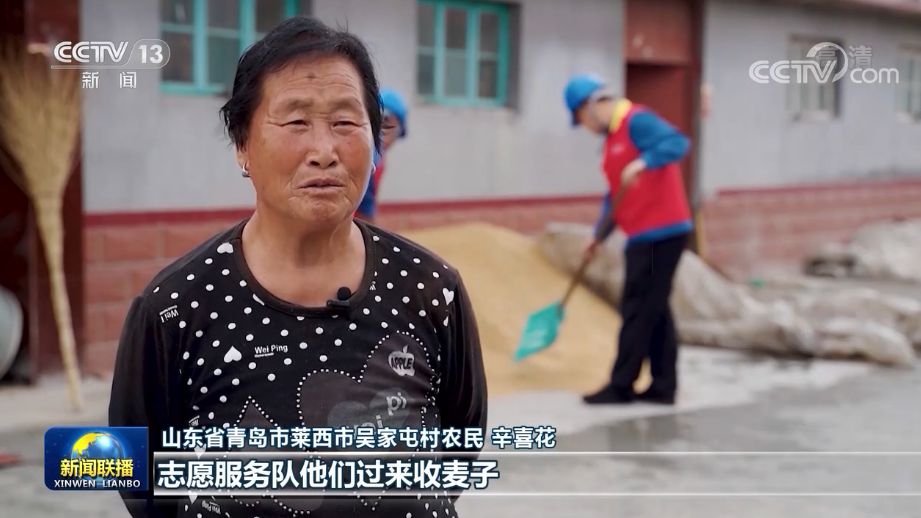 在山東萊西,66萬多畝小麥進入集中收獲期,當(dāng)?shù)?0多家社會化服務(wù)組織和志愿服務(wù)隊活躍在麥收一線。吳家屯村農(nóng)民辛喜花的孩子在外打工,在志愿服務(wù)隊幫助下,她家3畝多小麥不到一小時就收獲完成運送到家。