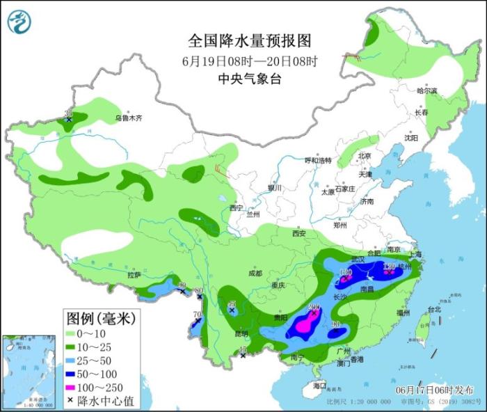 6月19日08時至20日08時,江淮西南部、江南中北部和西部、華南中西部以及西南地區(qū)南部、西藏東南部等地的部分地區(qū)有中到大雨,其中,貴州東南部、湖北東南部、安徽南部、湖南東北部和中南部、江西北部、浙江中西部、廣西中北部、廣東北部、云南西北部等地部分地區(qū)有暴雨,局地大暴雨(100~200毫米)。內(nèi)蒙古東北部、甘肅西部等地的部分地區(qū)有4~6級風(fēng);北部灣、南海西北部和中西部將有5~6級、陣風(fēng)7級的偏南到西南風(fēng)。