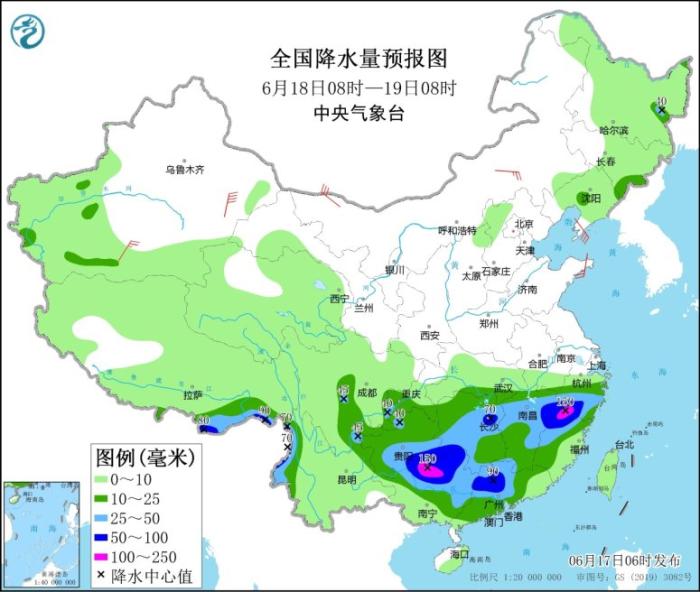 6月18日08時至19日08時,江南大部、華南大部以及西南地區(qū)東南部、西藏東南部、云南西北部等地的部分地區(qū)有中到大雨,其中,貴州東南部、湖南東部和南部、江西中北部、浙江南部、福建西北部、廣西北部、廣東北部、云南西北部、西藏東南部等地的部分地區(qū)有暴雨,局地大暴雨(100~150毫米)。新疆南疆盆地、內(nèi)蒙古中西部、遼東半島、山東半島等地的部分地區(qū)有4~6級風(fēng),其中新疆東部部分地區(qū)風(fēng)力可達(dá)7級以上;北部灣、南海西北部海域?qū)⒂?~6級、陣風(fēng)7級的偏南到西南風(fēng)。