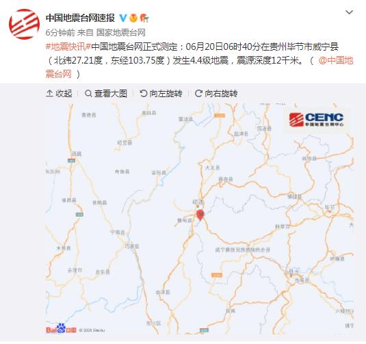 貴州畢節(jié)市威寧縣發(fā)生4.4級地震 震源深度12千米