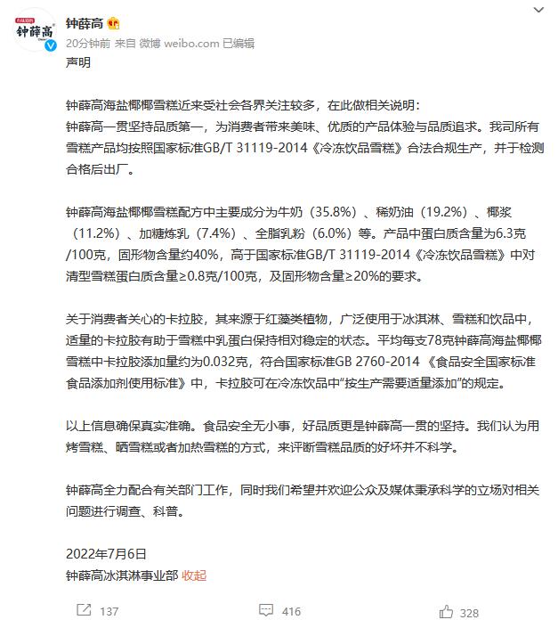 關(guān)于消費(fèi)者關(guān)心的卡拉膠,聲明稱,其來源于紅藻類植物,廣泛使用于冰淇淋、雪糕和飲品中,適量的卡拉膠有助于雪糕中乳蛋白保持相對(duì)穩(wěn)定的狀態(tài)。平均每支78克鐘薛高海鹽椰椰雪糕中卡拉膠添加量約為0.032克,符合國家標(biāo)準(zhǔn)GB 2760-2014 《食品安全國家標(biāo)準(zhǔn)食品添加劑使用標(biāo)準(zhǔn)》中,卡拉膠可在冷凍飲品中“按生產(chǎn)需要適量添加”的規(guī)定。