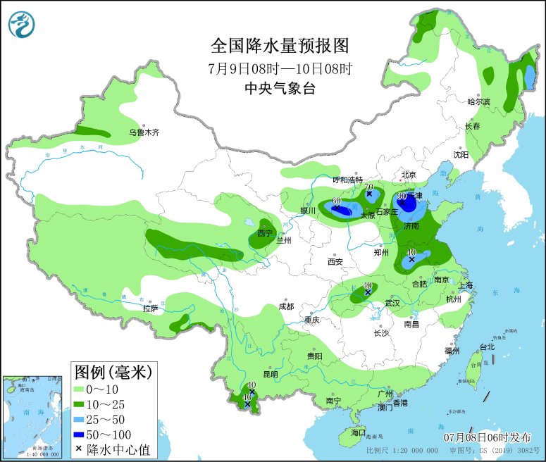 全國降水量預(yù)報(bào)圖(7月8日08時(shí)-9日08時(shí))