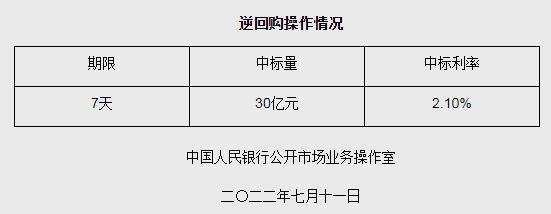 中新網(wǎng)7月11日電 據(jù)中國(guó)人民銀行網(wǎng)站消息,為維護(hù)銀行體系流動(dòng)性合理充裕,2022年7月11日人民銀行以利率招標(biāo)方式開展了30億元逆回購操作,中標(biāo)利率2.10%。(中新財(cái)經(jīng))