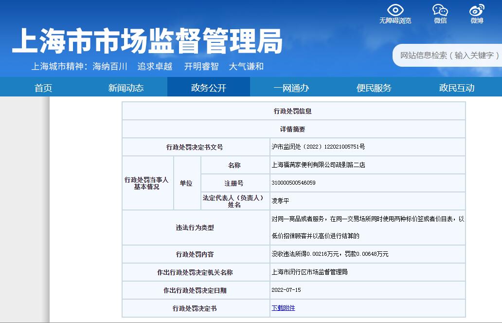 中新網(wǎng)7月27日電 上海市市場監(jiān)督管理局網(wǎng)站顯示,近日,上海福滿家便利有限公司疏影路二店,因?qū)ν簧唐坊蛘叻?wù),在同一交易場所同時使用兩種標(biāo)價簽或者價目表,以低價招徠顧客并以高價進(jìn)行結(jié)算,被上海市閔行區(qū)市場監(jiān)督管理局沒收違法所得21.6元、罰款64.8元。
