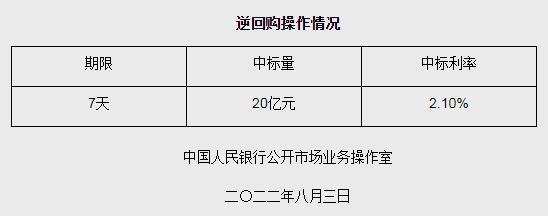 央行8月3日開展20億元逆回購操作 中標(biāo)利率2.10%