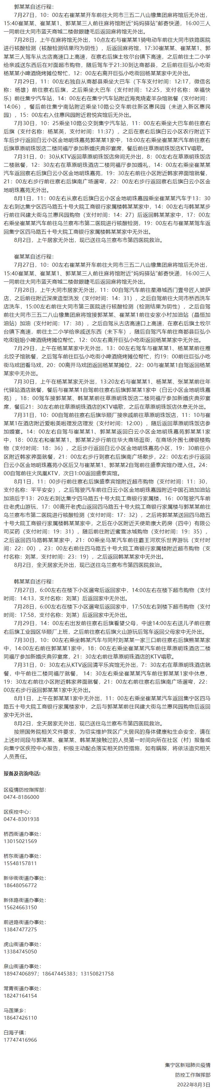 2022年8月2日,內蒙古烏蘭察布市集寧區(qū)在居民“愿檢盡檢”中發(fā)現(xiàn)一管混檢異常樣本,隨即對所有混檢人員進行單采單檢,其中大同市前來集寧區(qū)人員郭某某為初篩陽性,同時對郭某某同行同住人員進行核酸檢測,同行同住人員崔某某、韓某某為初篩陽性,目前此3例初篩陽性人員均已轉運至定點救治醫(yī)院,現(xiàn)將3人的行程軌跡公布如下: