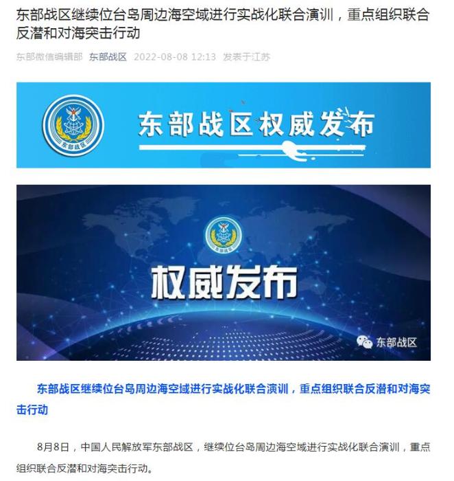 中新網(wǎng)8月8日電 據(jù)東部戰(zhàn)區(qū)微信公眾號消息,8月8日,中國人民解放軍東部戰(zhàn)區(qū)繼續(xù)位臺島周邊??沼蜻M行實戰(zhàn)化聯(lián)合演訓,重點組織聯(lián)合反潛和對海突擊行動。