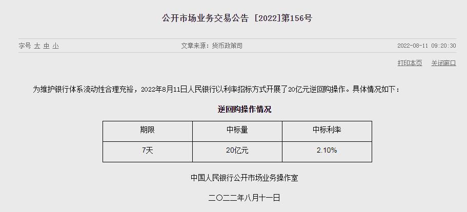 央行8月11日進(jìn)行20億元7天期逆回購(gòu)操作