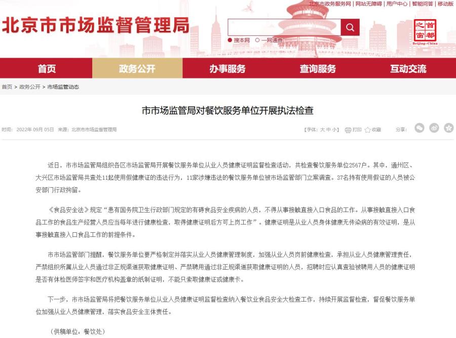 中新網(wǎng)9月5日電 據(jù)北京市市場(chǎng)監(jiān)督管理局網(wǎng)站5日消息,近日,北京市市場(chǎng)監(jiān)管局組織各區(qū)市場(chǎng)監(jiān)管局開展餐飲服務(wù)單位從業(yè)人員健康證明監(jiān)督檢查活動(dòng),共檢查餐飲服務(wù)單位2567戶。其中,通州區(qū)、大興區(qū)市場(chǎng)監(jiān)管局共查處11起使用假健康證的違法行為,11家涉嫌違法的餐飲服務(wù)單位被市場(chǎng)監(jiān)管部門立案調(diào)查。37名持有使用假證的人員被公安部門行政拘留。